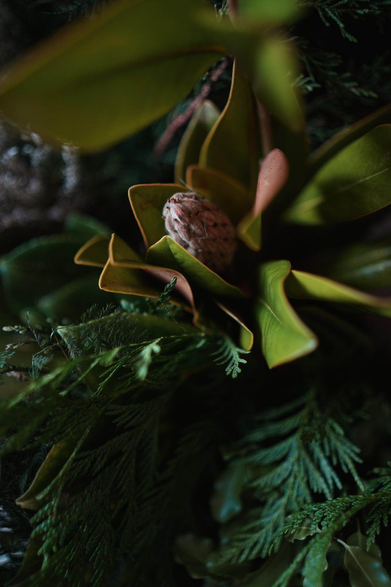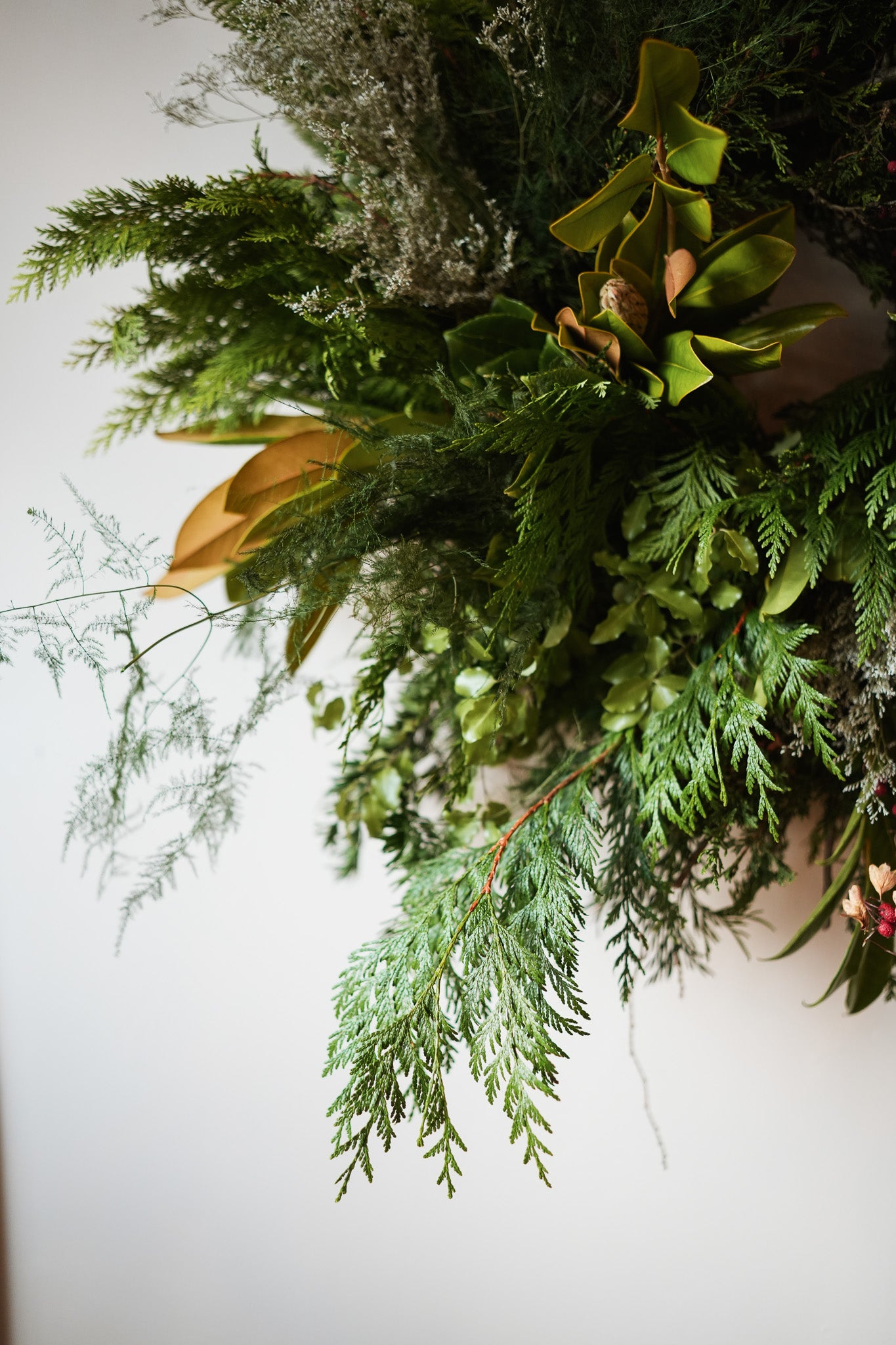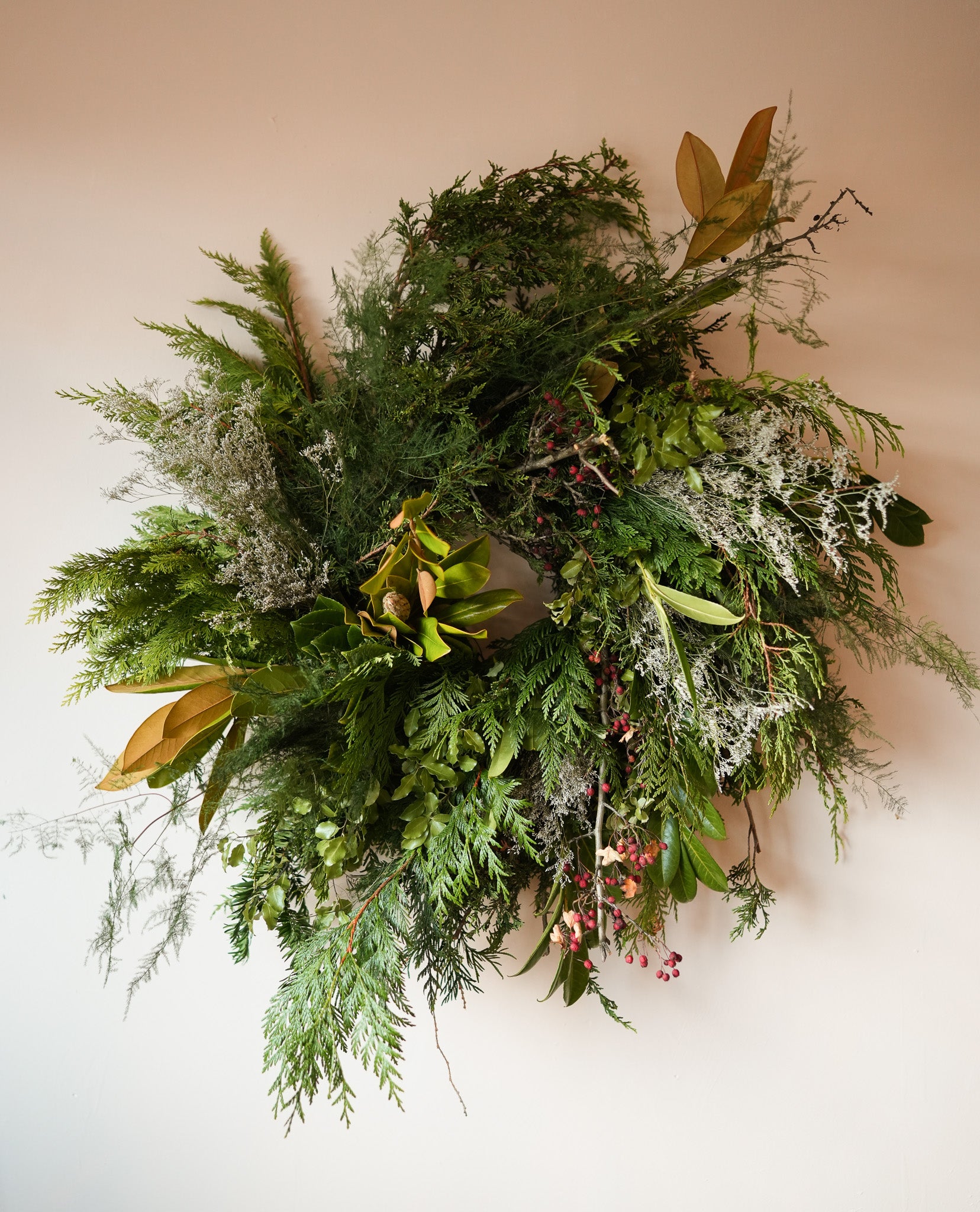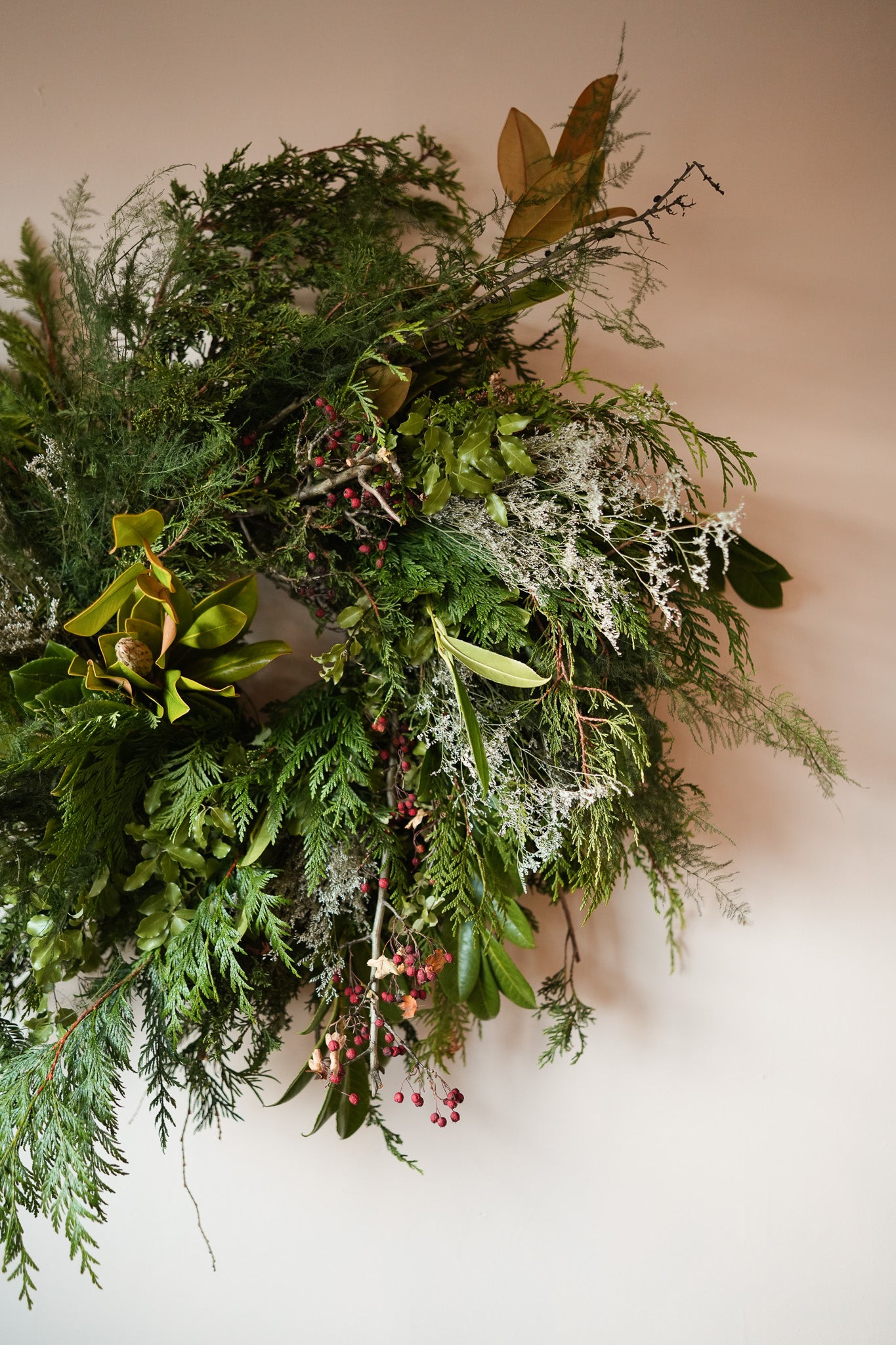 A beautiful large statement wreath filled with conifer, magnolia, limonium, asparagus ferns, berries, and foraged branches. A super gorgeous Christmas edition!