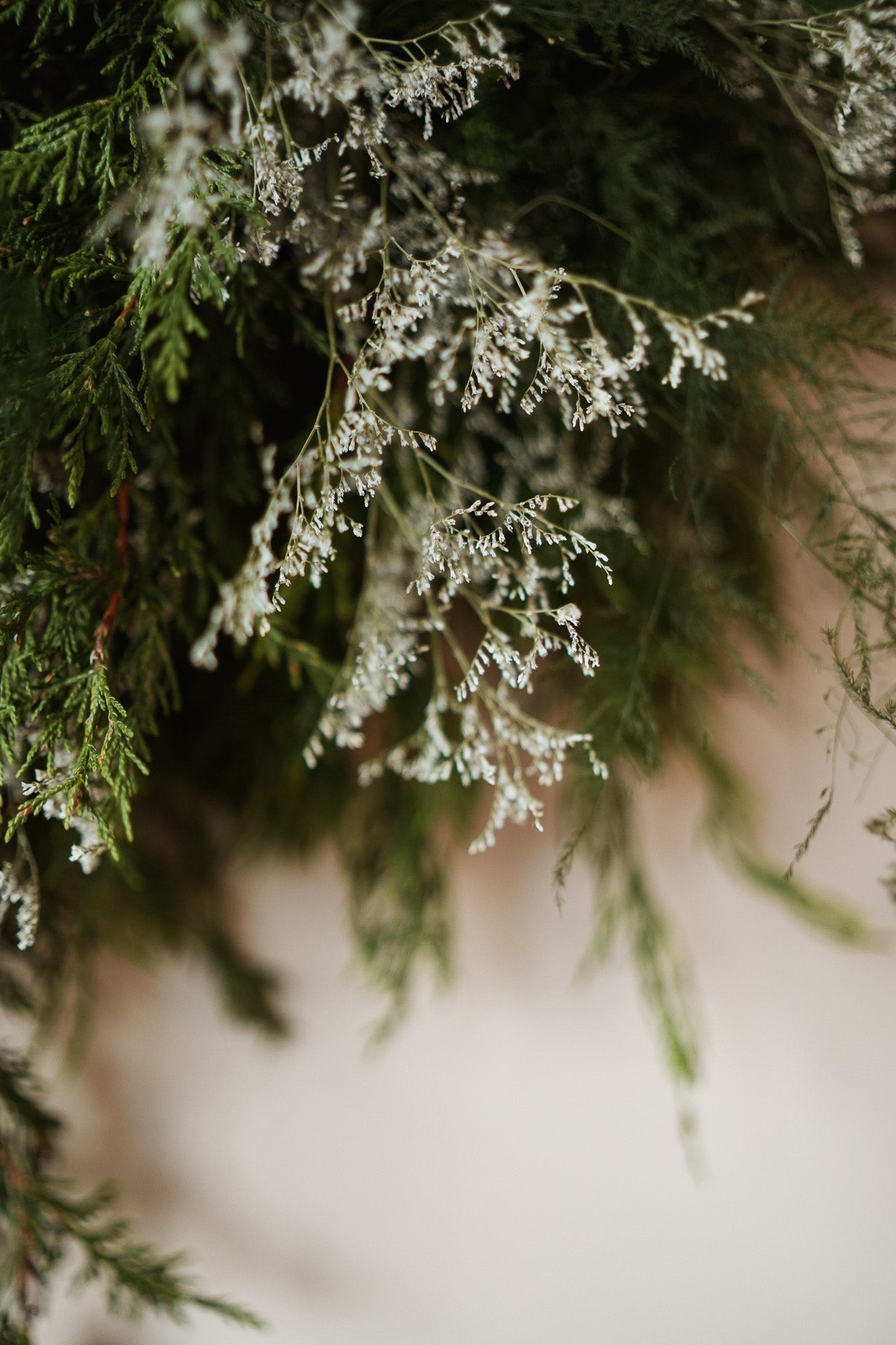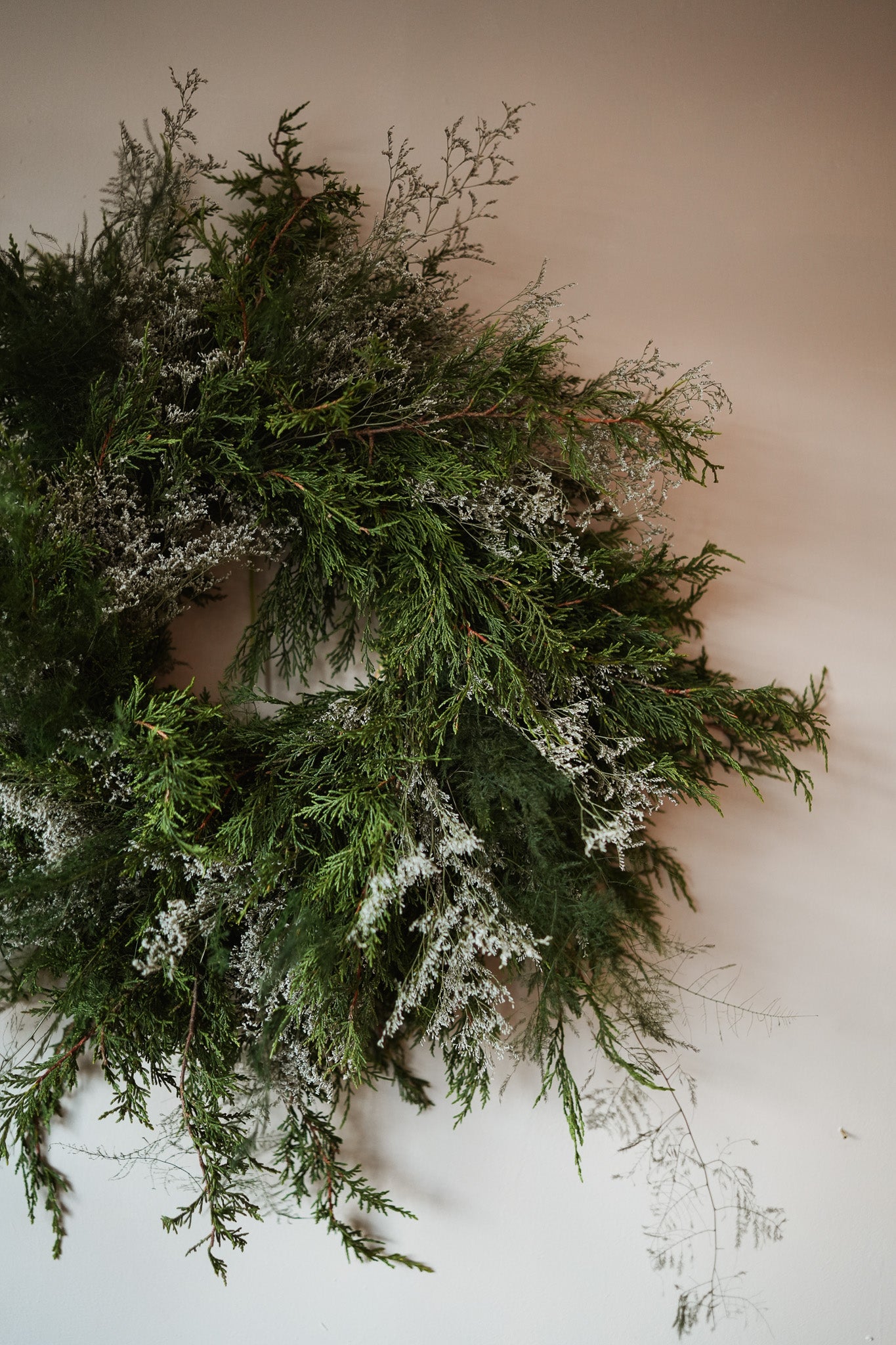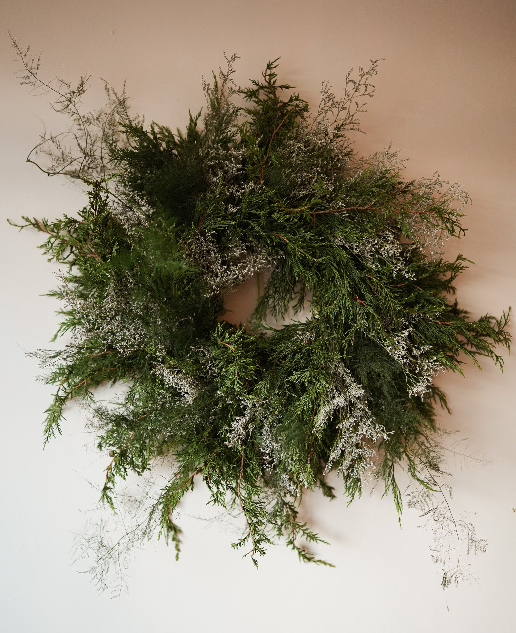 A beautiful statement wreath filled with conifer, limonium & asparagus fern. A perfect addition for the festive season!