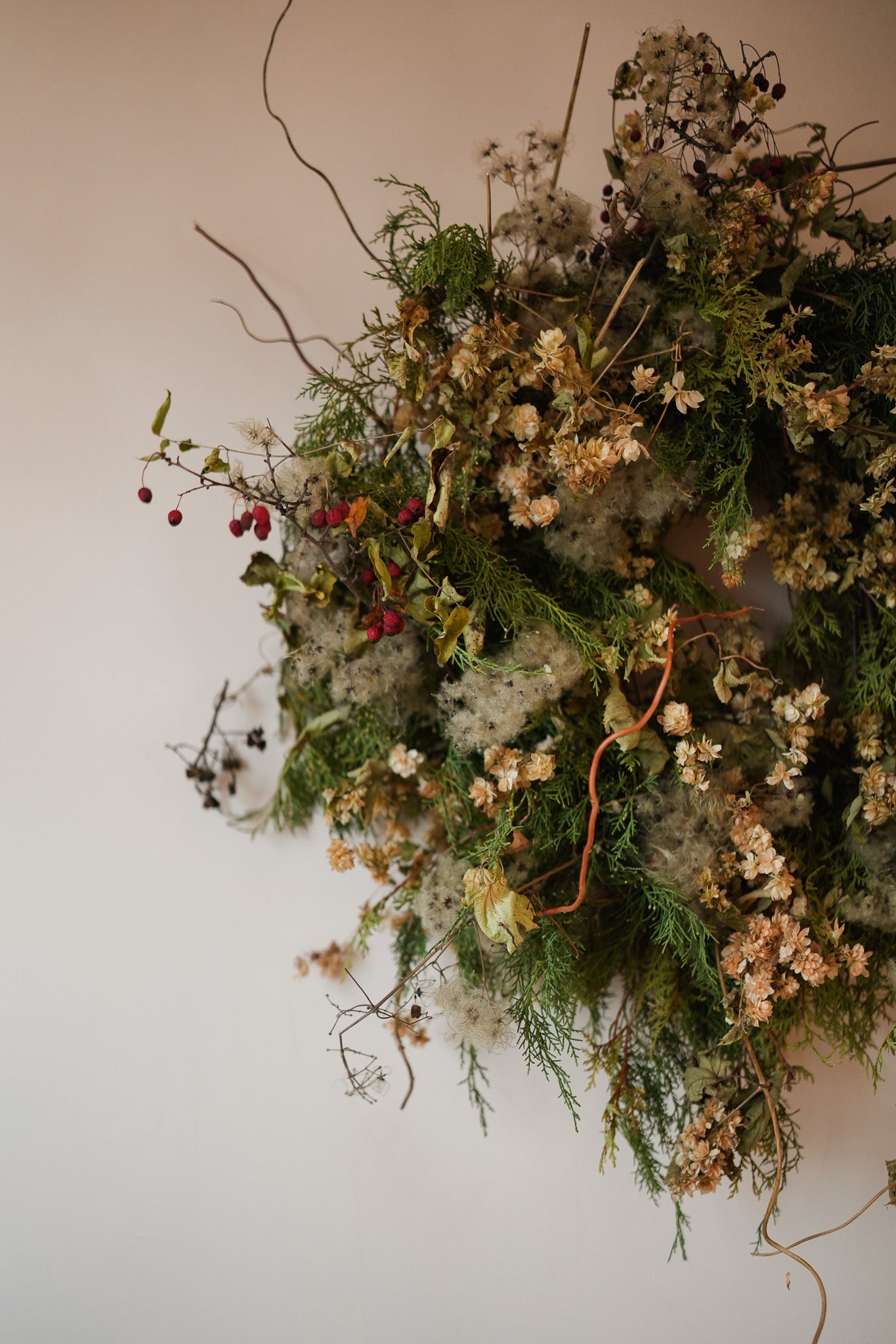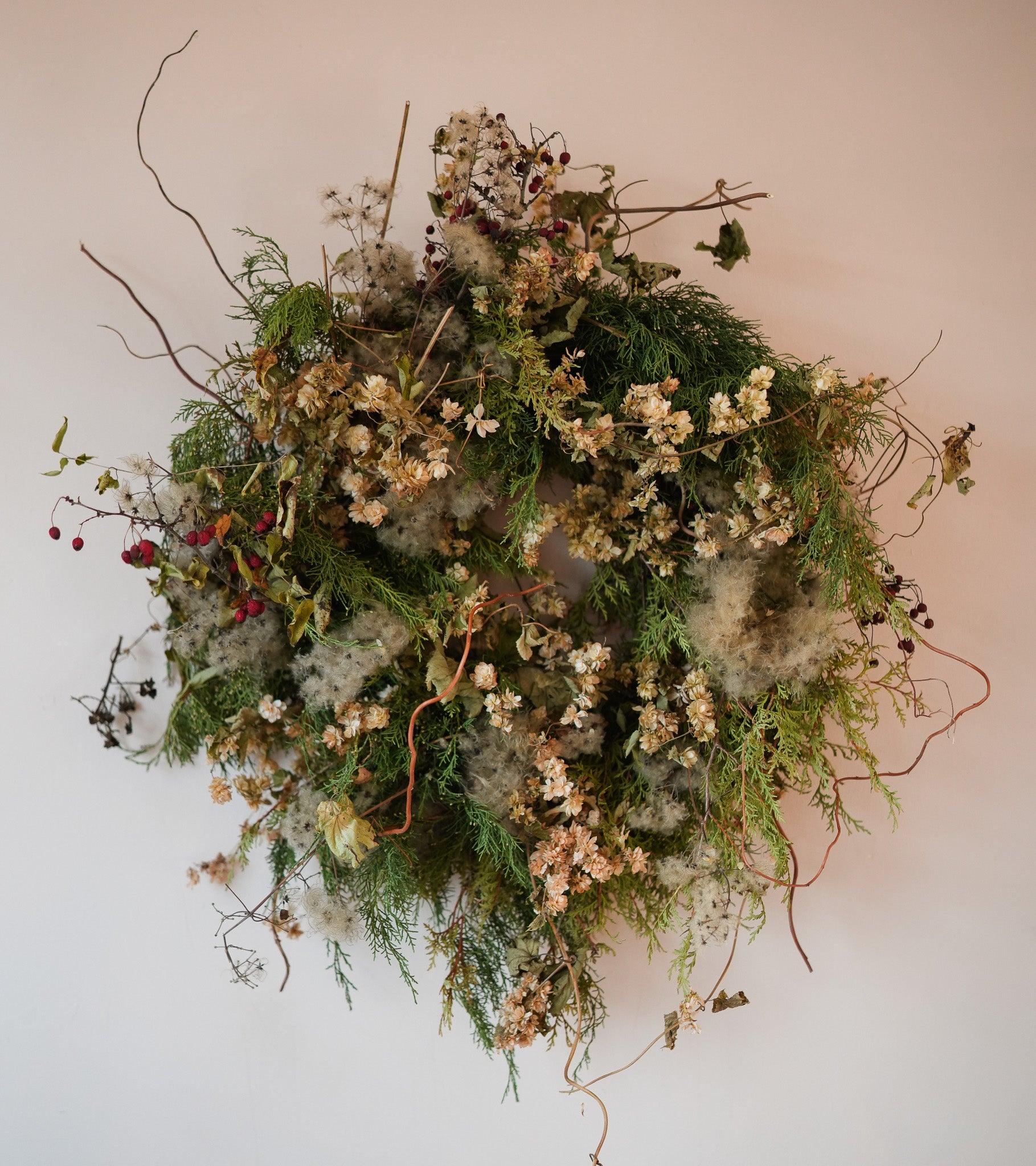 A beautiful wreath filled with conifer, hops, old man’s beard & berries. A wild style for the festive season!