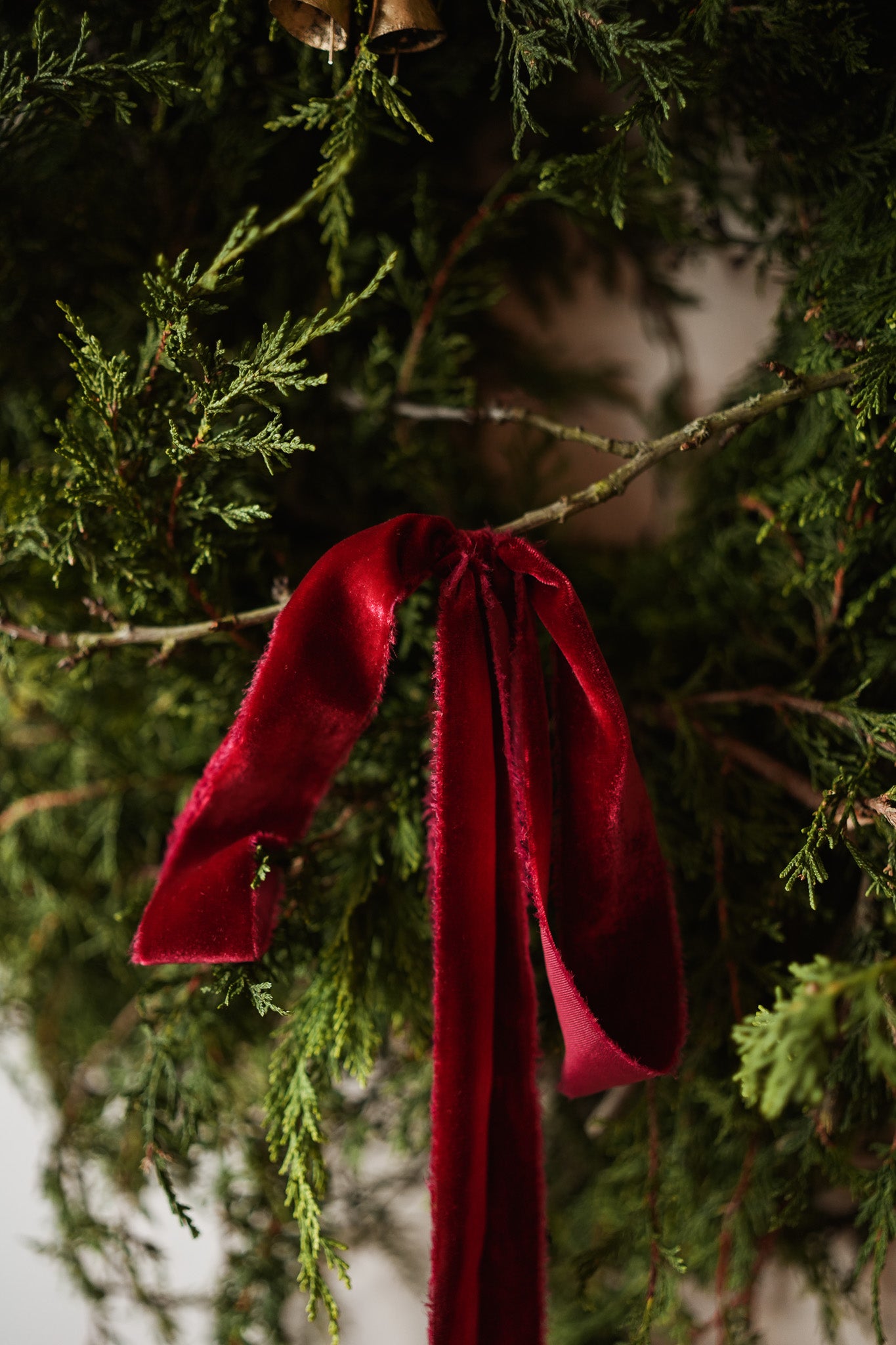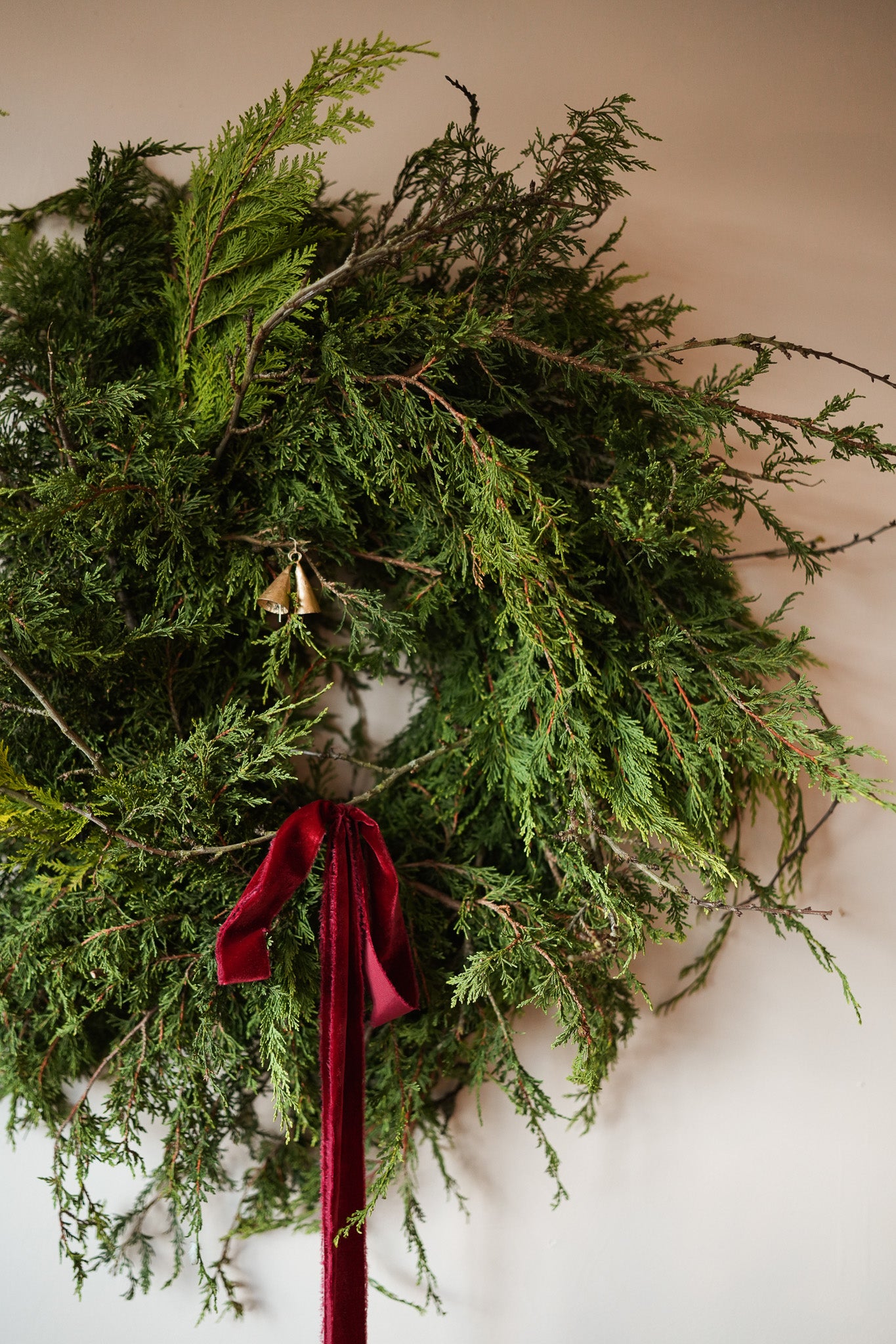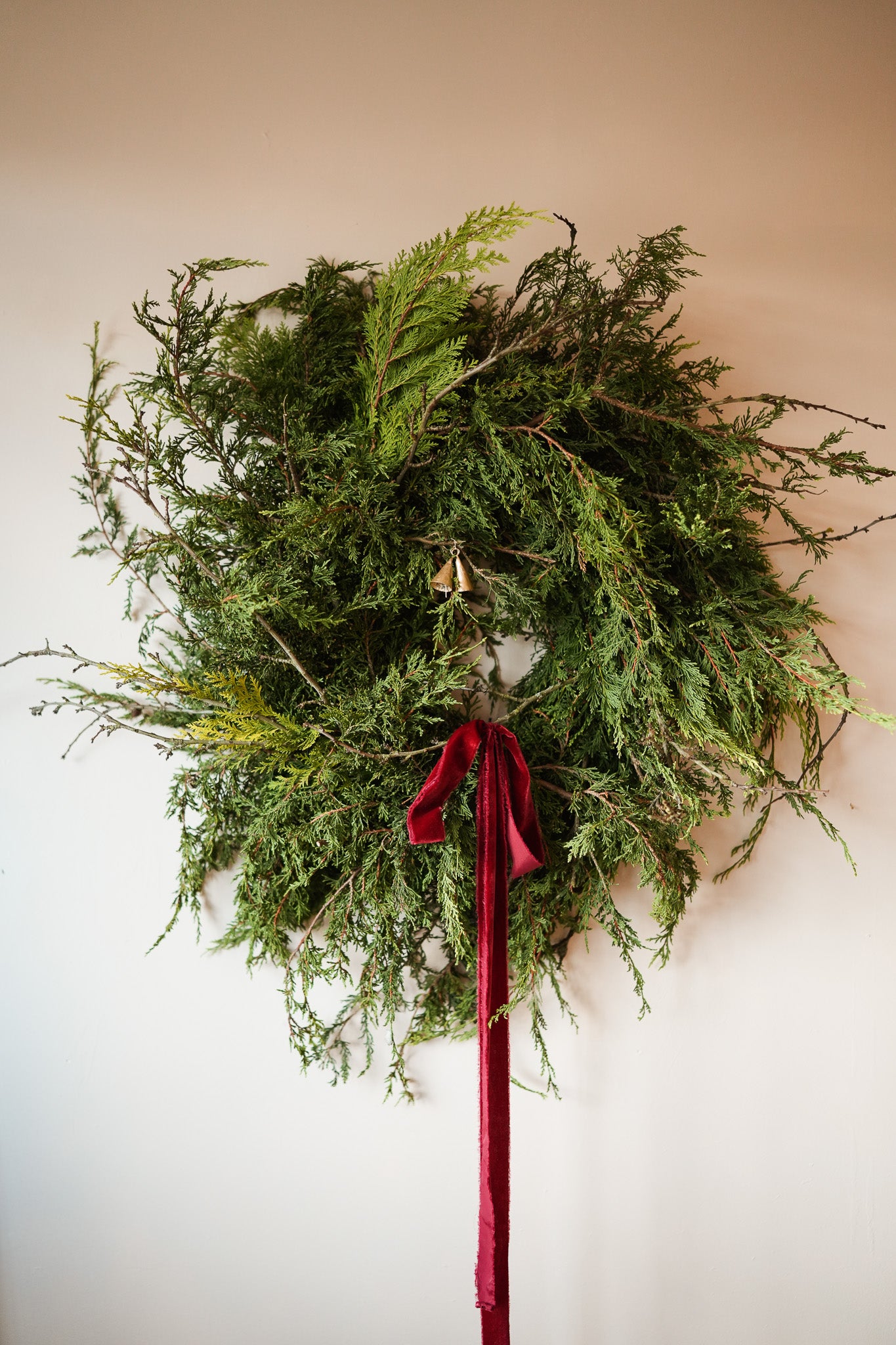 A beautiful large statement wreath filled to the brim with conifer. A truly stunning addition for the Christmas season! Finished with bells and a velvet hand torn ribbon
